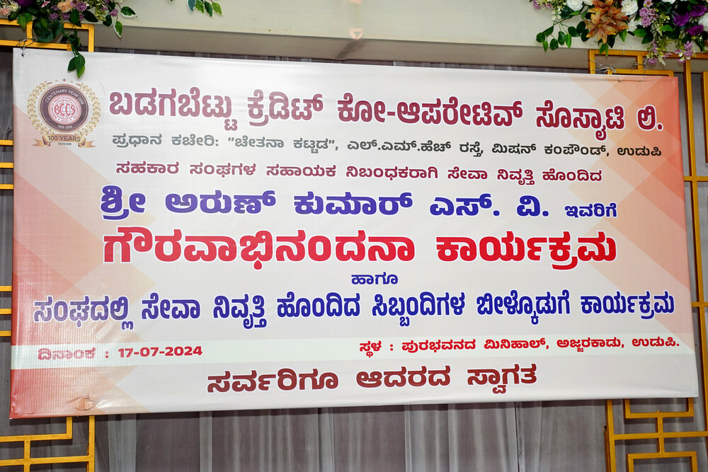 ಸಹಕಾರ ಸಂಘಗಳ ಸಹಾಯಕ ನಿಬಂಧಕರಾಗಿ ನಿವೃತ್ತಿ ಹೊಂದಿದ ಅರುಣ್ ಕುಮಾರ್ ಎಸ್.ವಿ. ಅವರನ್ನು ಉಡುಪಿಯ ಬಡಗಬೆಟ್ಟು ಕ್ರೆಡಿಟ್ ಕೋ-ಆಪರೇಟಿವ್ ಸೊಸೈಟಿಯ ವತಿಯಿಂದ ಗೌರವಾಭಿನಂದನೆ ಕಾರ್ಯಕ್ರಮವು ನಗರದ ಅಜ್ಜರಕಾಡು ಪುರಭವನ ಮಿನಿಹಾಲ್ನಲ್ಲಿ ನಡೆಯಿತು.