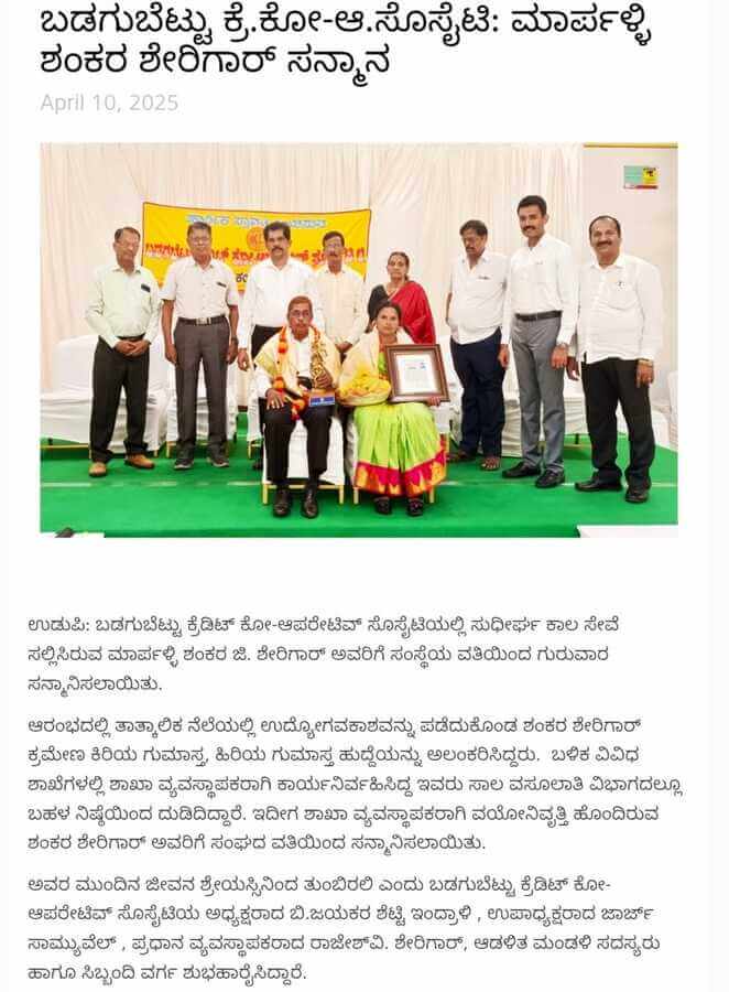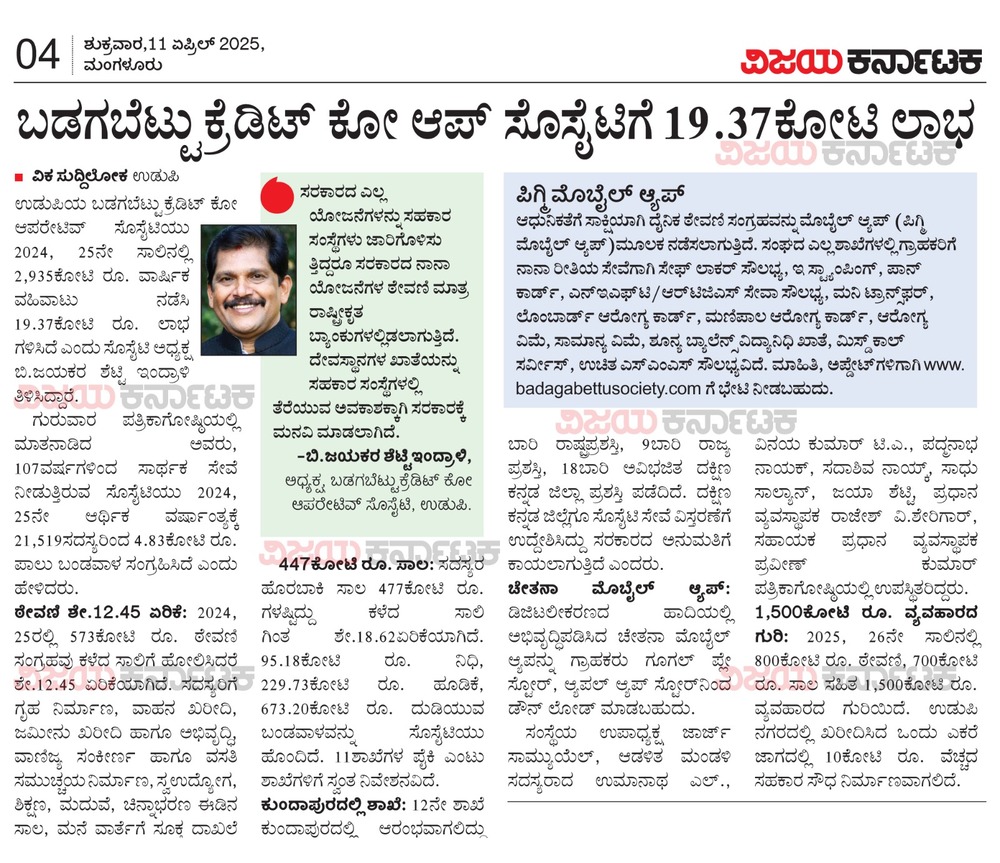 72ನೇ ಅಖಿಲ ಭಾರತ ಸಹಕಾರ ಸಪ್ತಾಹ ರಾಜ್ಯ ಮಟ್ಟದ ಕಾರ್ಯಕ್ರಮದಲ್ಲಿ ಬಡಗಬೆಟ್ಟು ಸಹಕಾರ ಸಂಘವು ‘ಸಹಕಾರ ಮಾಣಿಕ್ಯ’ ಪ್ರಶಸ್ತಿಯನ್ನು ಪಡೆದು ವಿಶಿಷ್ಟ ಸಾಧನೆ ಮಾಡಿದೆ.
